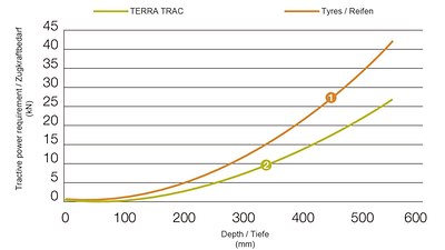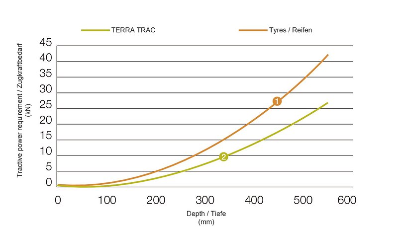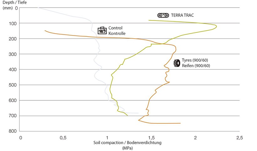 Si le système de chenilles TERRA TRAC est numéro un mondial dans le monde agricole, ce n'est pas un hasard. Les milliers de machines qui l'utilisent ont depuis longtemps démontré ses avantages sur le terrain. Ceux-ci ont également été confirmés dans une étude réalisée en 2006 par la Cranfield University à Silsoe, en Grande-Bretagne, où, grâce à un pénétromètre, on a mesuré les niveaux de compaction des sols et fait apparaître de grosses différences entre machines à pneus et machines chenillées.