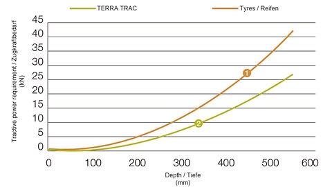 - Malgré un poids supérieur, le système TERRA TRAC déforme nettement moins le sol. À une profondeur de 10 à 60 cm, la déformation est inférieure de près de 65 % en moyenne par rapport à celle générée par une machine dotée de pneus de 900/60, selon l'étude.